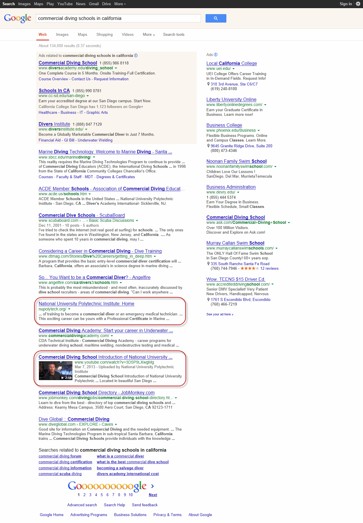 When I first started working for National University, the Golf Academy had a two year old YouTube channel that had outstanding "how to" golfing videos on it. However, the videos had titles like Beverly - Setup for Clubs_Md.mov and Doug - One handed Club Path_Md.mov . I knew then and there that the videos had to be search engine optimized and given the proper tagging if anyone was to ever find and utilize this fantastic resource. As a result, the views for the channel have grown to over 1.5 million and the subscribers have also grown to over 2700 as of this writing. There have also been some other wonderful side effects as a result. The National University Golf Academy experienced a 95% increase in admissions via its YouTube channel in 2013. And you can also find certain videos at the top of the SERPs for such keyord phrases as chin putter .